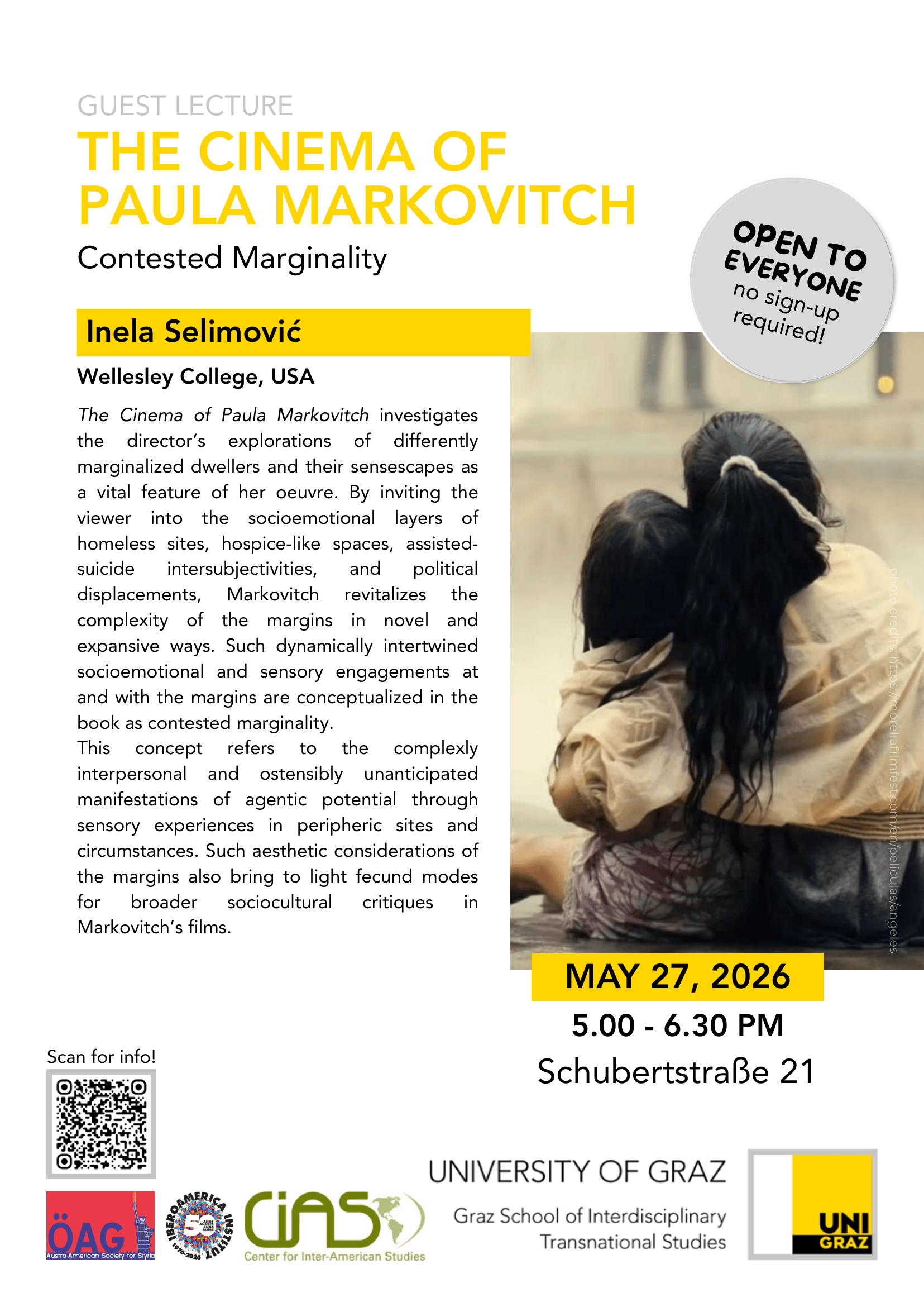 The lecture explores the films of Argentine-Mexican director Paula Markovitch, focusing on how her work portrays marginalized individuals and spaces. Through cinematic engagement with environments such as homeless sites, hospice-like spaces, assisted-suicide contexts, and political displacement, Markovitch’s films invite viewers into complex socioemotional and sensory worlds.